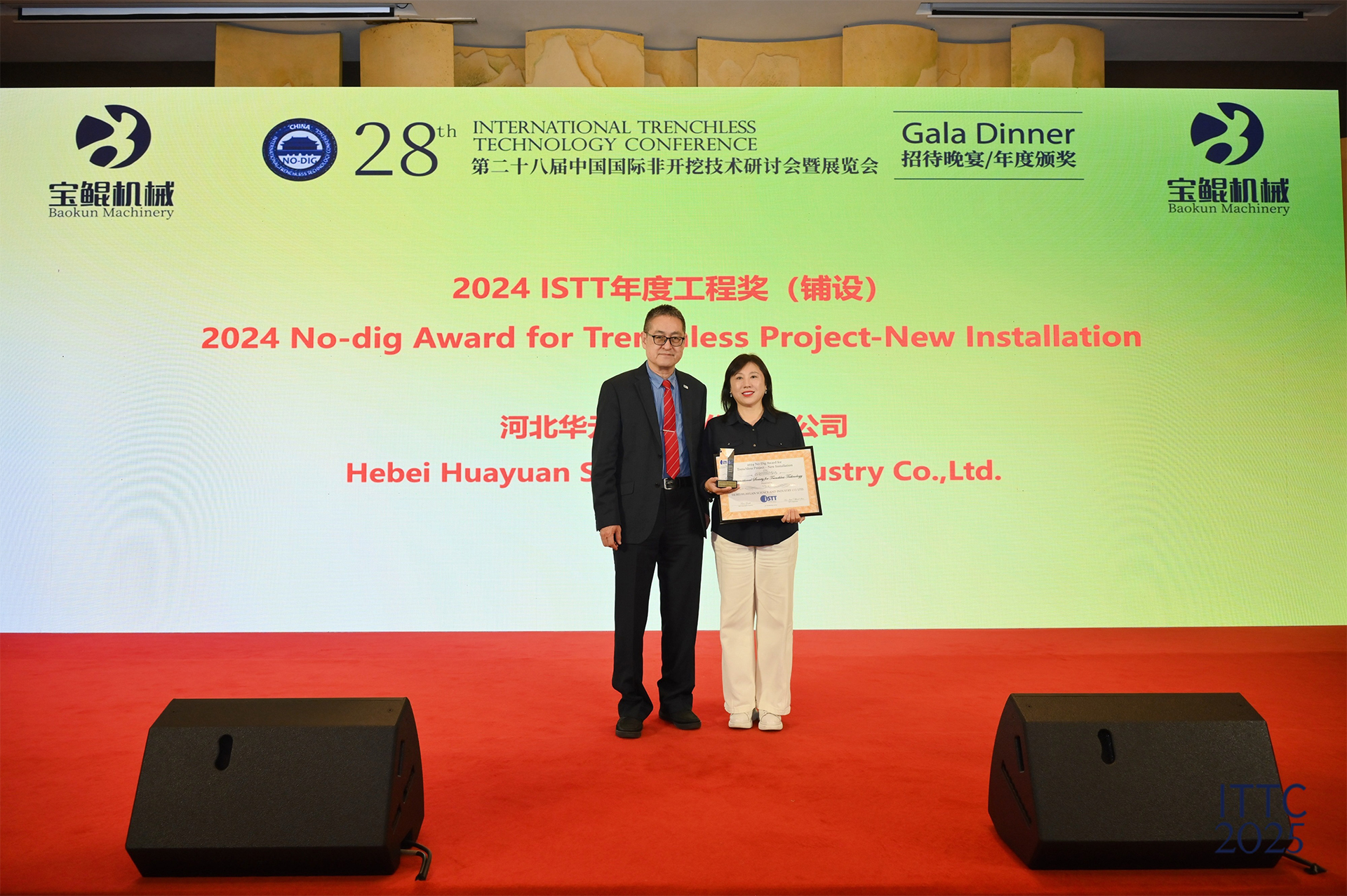 During the prestigious awards ceremony at this event, Hebei Huayuan Science and Industry Co., Ltd. was honored with the 2024 “Outstanding Trenchless Project Award of China” for its Gas Supply Pipeline Project from Dachan Island to Mawan Power Plant, and also received the 2024 “Outstanding Trenchless Technology Award of China” for its Offshore HDD Construction Platform Technology. Notably, Professor KeJian Shou, Chairman of the International Society for Trenchless Technology (ISTT), presented Huayuan with the 2024 ISTT Project Award (New Installation Category)—marking the first time this international award has been presented domestically. These honors not only recognize Huayuan’s capability for technological innovation, but also greatly encourage its resolve to continue overcoming challenges and pushing boundaries in the future.
