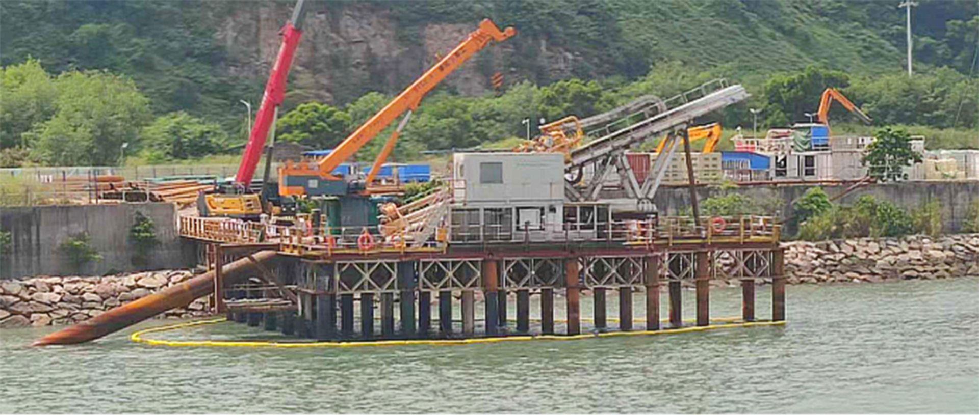 Due to site constraints on the Dachan Island side of the pipeline project, the entry point was located offshore near the shoreline. To address this challenge, Huayuan developed an innovative modular offshore construction platform. The platform is composed of steel pipe piles, pile caps, connecting beams, pile collars, trusses, tie rod mechanisms, walkway units, drill rig base frame, and crane base frame. Designed for rapid assembly with small components, the platform allows flexible expansion and diverse configuration shapes, significantly reducing the construction time of the HDD platform. Its structure is engineered to withstand complex marine conditions with high resistance to wind and waves. During construction, the platform’s reliability was thoroughly validated under the super typhoon "Saola," providing critical technical support and valuable experience for offshore HDD operations.
